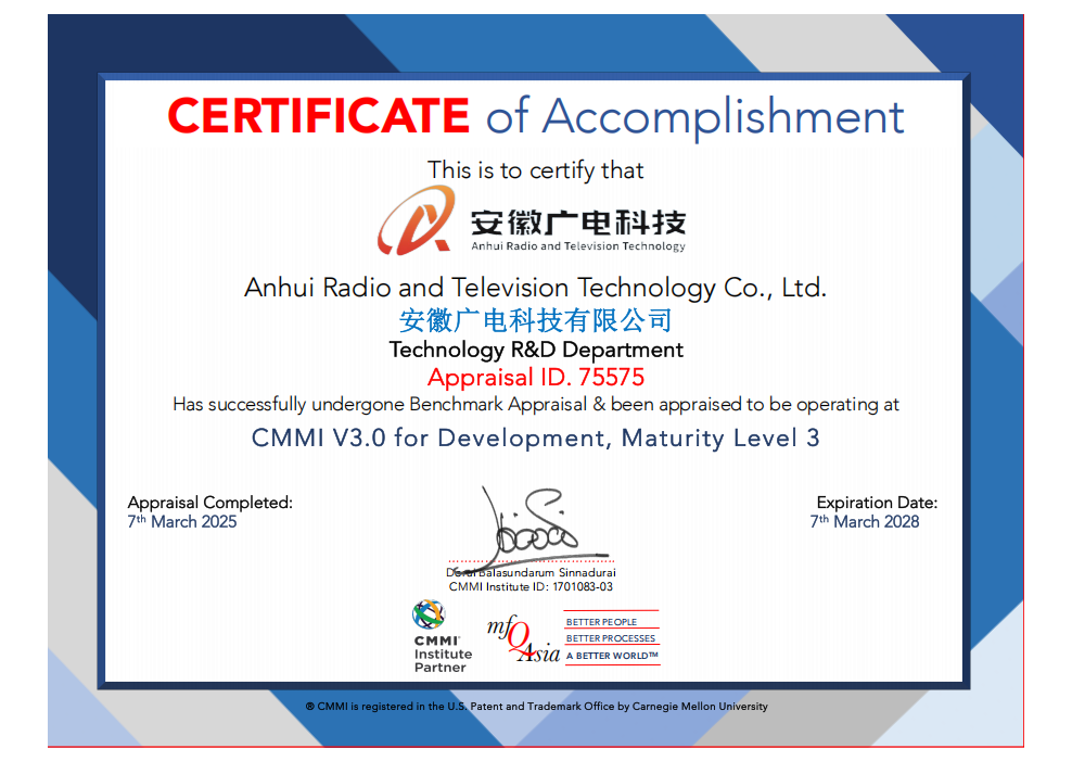 CMMI全称Capability Maturity Model Integration,即软件才能成熟度模型集成,是世界公认的软件产品的质量管理和质量保证标准。此次荣获CMMI 3级证书,标志着安徽广电科技公司在软件研发、项目管理及质量控制等方面达到行业先进程度,企业品牌价值进一步加强,竞标才能和客户信任度进一步提升。下一步,安徽广电科技公司将以更高标准推进技术创新、加快成果转化,持续赋能行业高质量凯时共赢,为智慧广电建设提供坚实技术支撑。